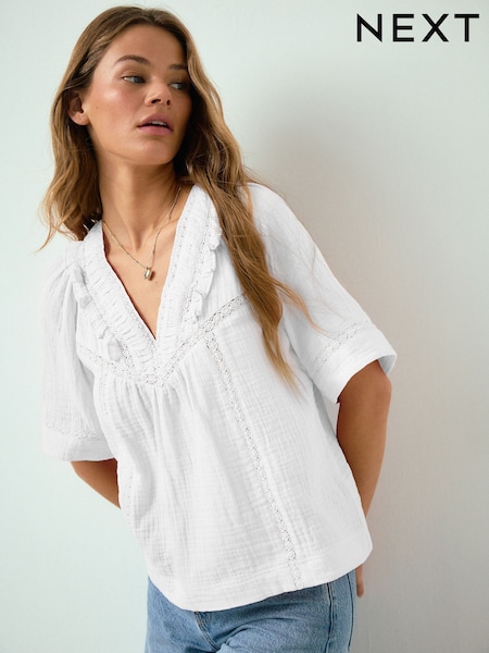 White/Blue Palm Print Flutter Sleeve Button Front Top With Linen