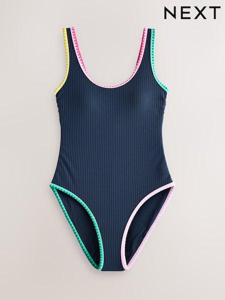 Contrast Binding Navy Rib Tummy Control Scoop Swimsuit