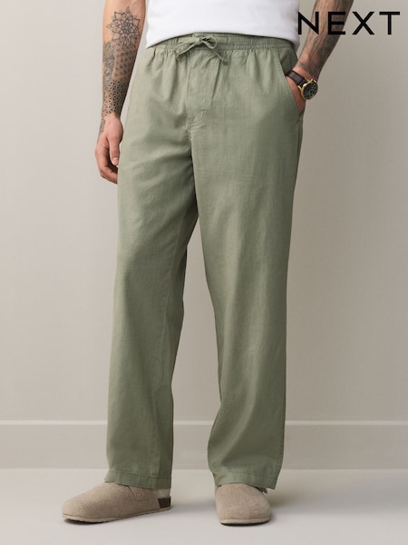 Vert kaki - Signature 100% Linen Textured Trousers With Elasticated Waist