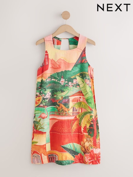 Red/Green Scene Printed - Robe courte trapèze à col carré en lin riche