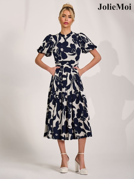 Jolie Moi Cream Turtle Neck Puff Sleeve Jersey Midi Dress