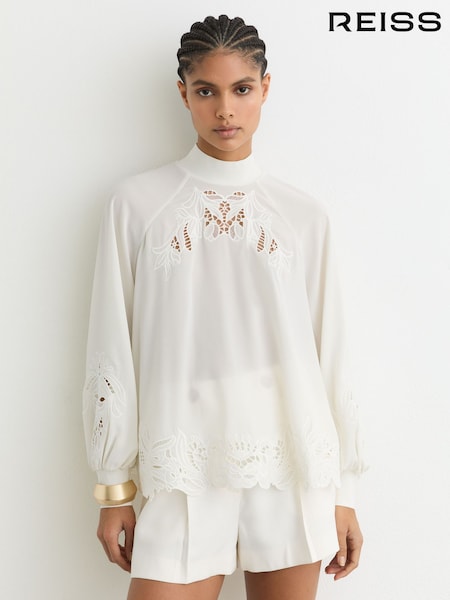 Reiss Cream Rae Broderie Blouson-Sleeve Blouse
