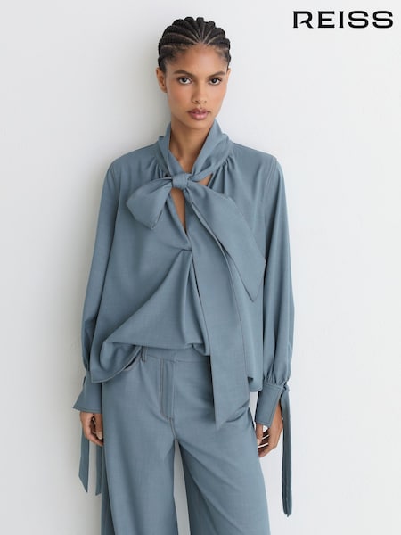 Reiss Light Blue Charlotte Denim-Look Tie-Neck Blouse
