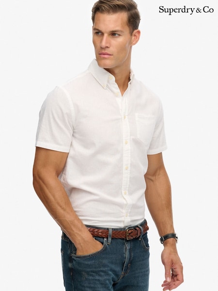 白色 - 领队 - 棉 亚麻布Blend 短袖 衬衫