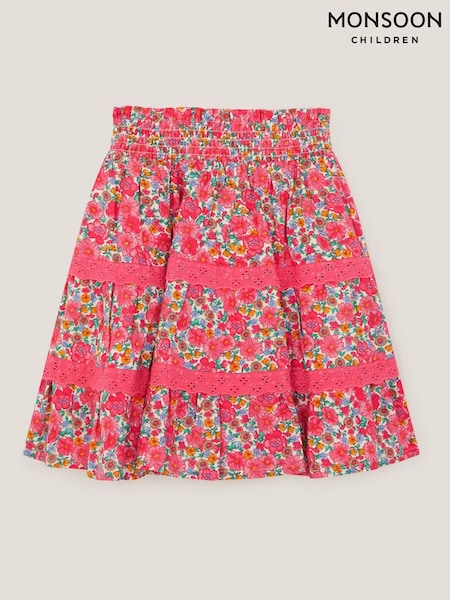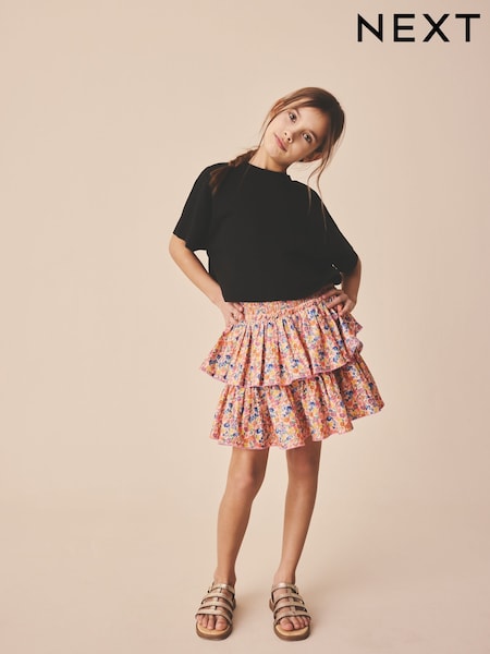 粉橙色花卉 - 褶皱多层半身裙(3-16岁)