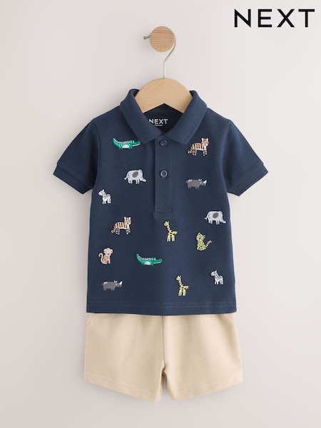 Navy All Over Embroidery Safari Animals Short Sleeve Polo Shirt and Shorts Set (3mths-7yrs)