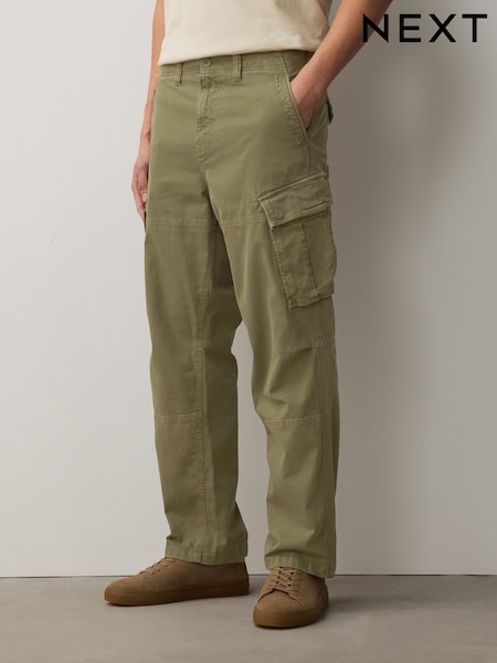 Khaki Green Relaxed Fit Authentic Washed Cotton Rich Cargo Trousers With Stretch