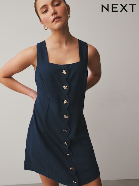 Washed Indigo Blue Scallop Edge Square Neck Button Through Mini Shift Dress
