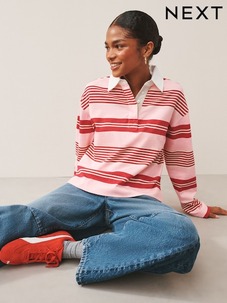 Pink/Red Stripe Collared Long Sleeve Rugby Top