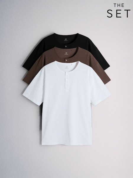 The Set Short Sleeve 3 Pack Cotton Henley T-Shirts Brown/White
