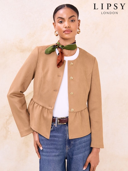 Lipsy Faux Suede Camel Collarless Peplum Hem Jacket