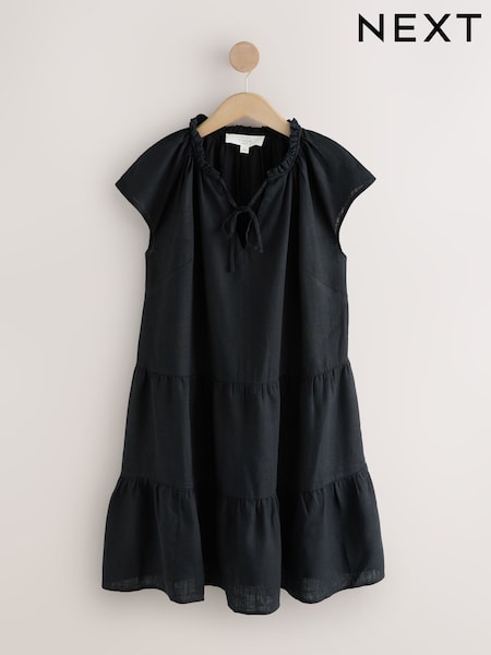 Black V-Neck Tiered Mini Dress with Linen