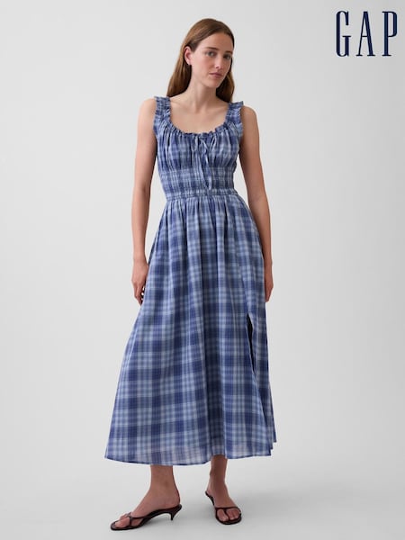 Gap Blue Check Voile Smocked Waist Maxi Dress
