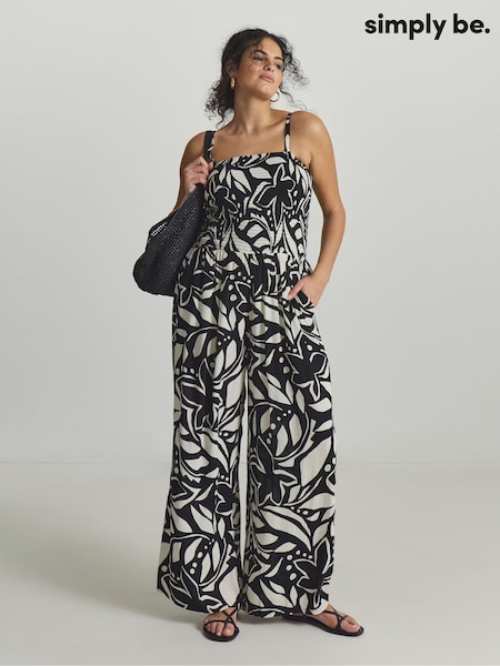 Simply Be Black Leaf Print Shirred Bandeau Beach Jumpsuit