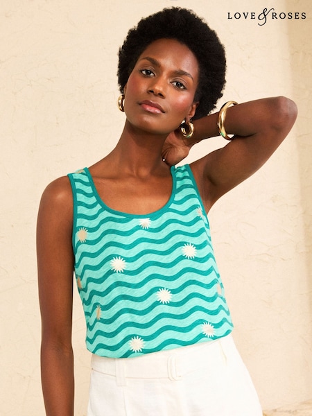 Love & Roses Aqua Blue Wavy Stripe Foil Print Scoop Neck Jersey Vest