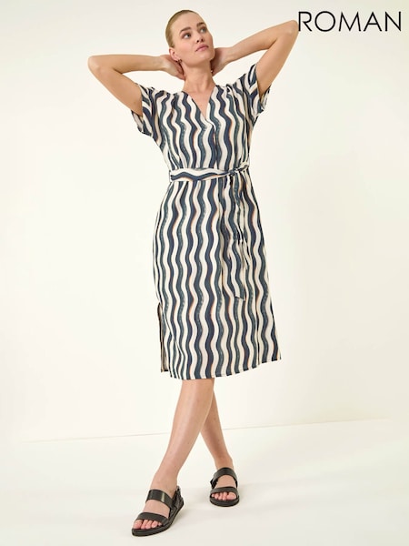 Roman Wave Print Belted Midi Dress
