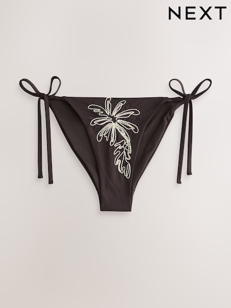 Chocoladebruin - Bikinibroekje met gestrikte zijkanten en palmprint en borduursels