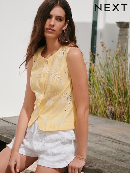 Yellow Shell Broderie Button Front Top