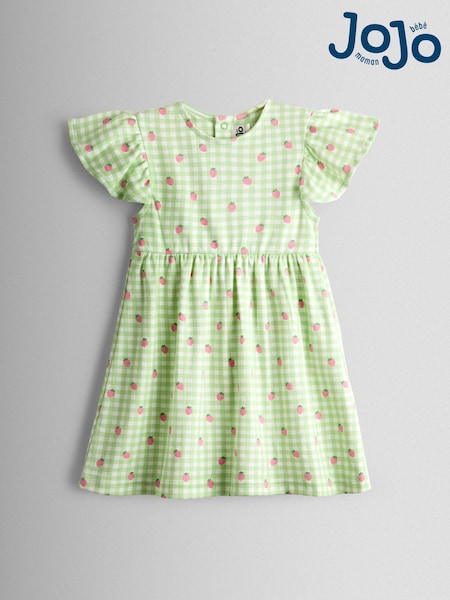 JoJo Maman Bébé Green Gingham Strawberry Printed Flutter Sleeve Dress