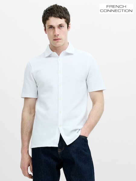 French Connection White Cotton Blend Textured Button Short Sleeve Shirt