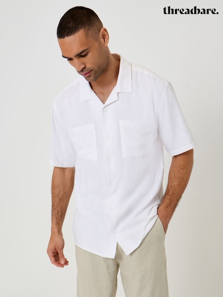 Threadbare White Relaxed Fit Linen Blend Revere Collar Short Sleeve Shirt