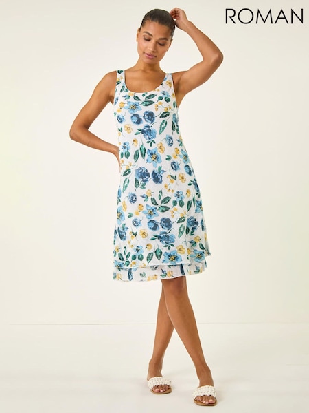 Roman Blue Floral Print Double Layer Dress