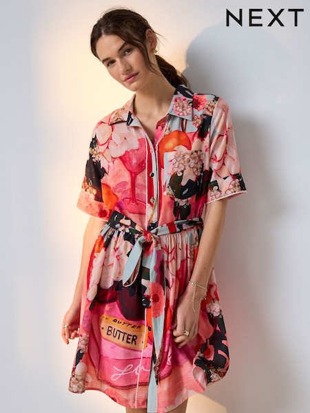 Sosandar Pink Floral Print Belted Shirt Dress