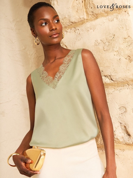 Sage Green Satin V-Neck Lace Trim Top