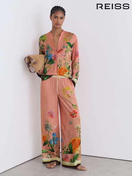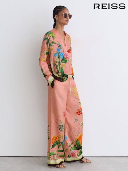 Reiss Pink Milos Tropical Scarf-Print Wide-Leg Trousers