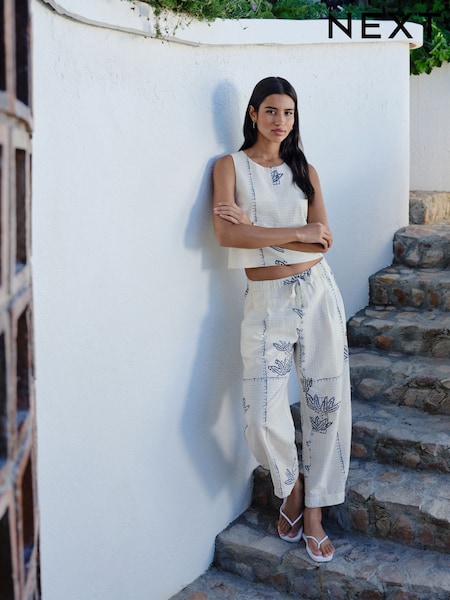 Ecru/Navy Palm Print Barrel Leg Trousers with Linen