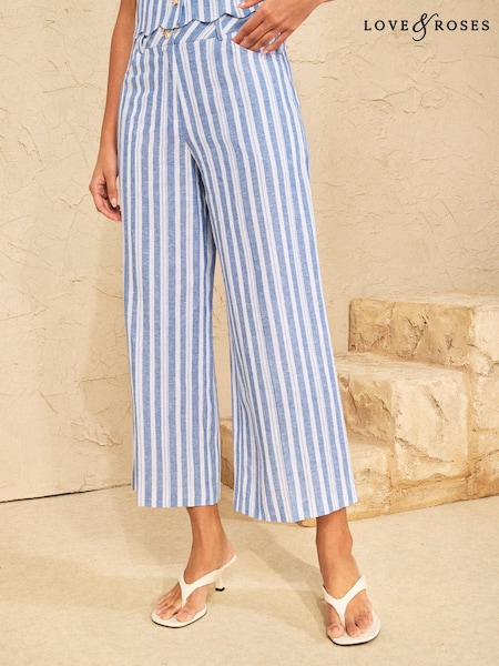 Love & Roses Blue Linen Look Striped Wide Crop Trousers