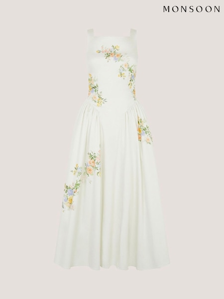 Monsoon Cream Sienna Frill Neck Floral Print Midi Dress