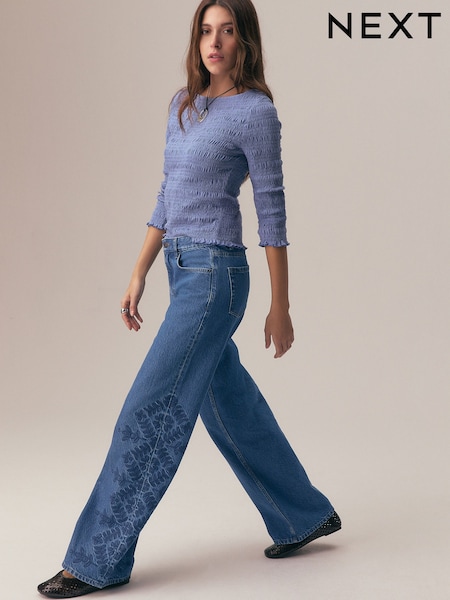 Dark Blue Floral Embroidered Wide Leg Jeans