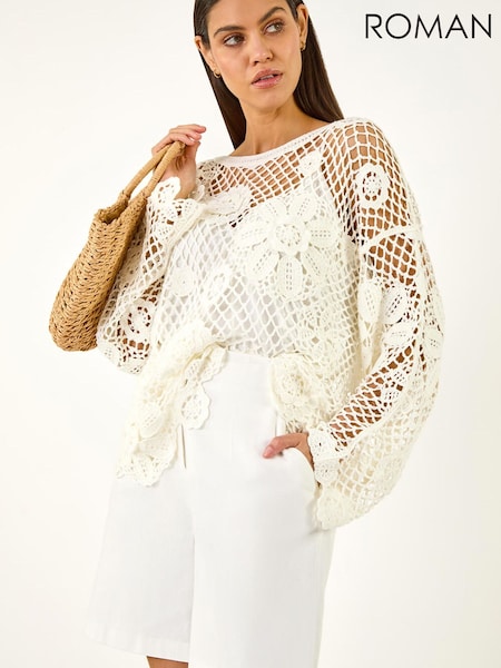 Roman White Floral Open Crochet Knit Tunic