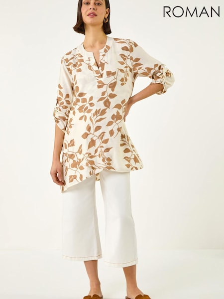 Roman White Leaf Print Wrap Hem Tunic Top