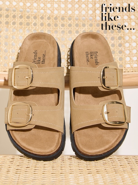 Friends Like These Natural Faux Suede Standard Fit Double Buckle Strap Flat Comfort Footbed Sandals