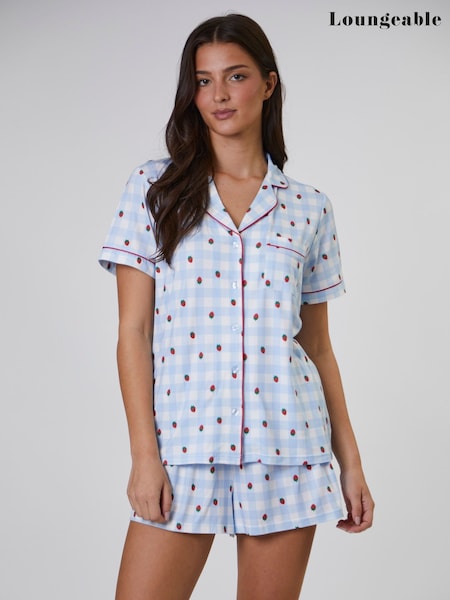 Loungeable Blue Strawberry Printed Supersoft Short Sleeve and Shorts Pyjamas Set
