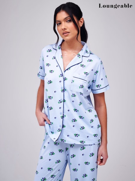 Loungeable Blue Blueberry Printed Super Soft Short Sleeve Revere Pyjama Set