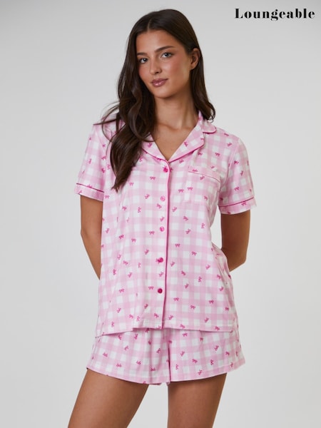 Loungeable Pink Checked Bow Detail Short Sleeve and Short Set Pyjamas