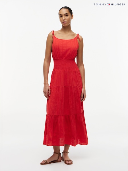 Tommy Hilfiger Red Seersucker Smock Tie Strap Midi Dress