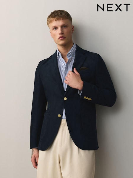 Navy Gold Buttons Slim Fit Faux Suede Blazer