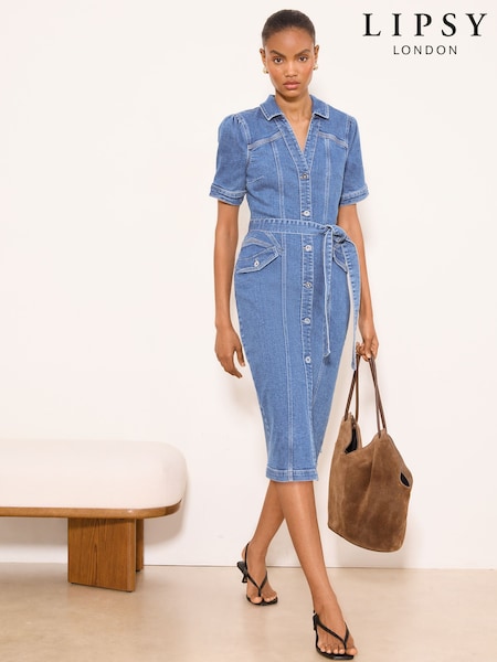Lipsy Mid Wash Blue Short Sleeve Denim Midi Dress