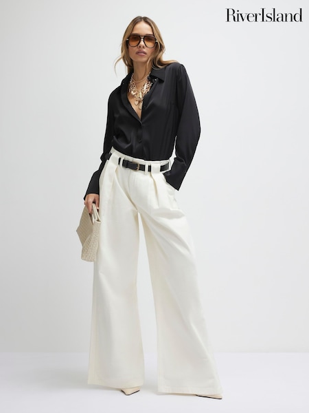River Island Cream Belted Pleated High Rise Wide Leg Jeans