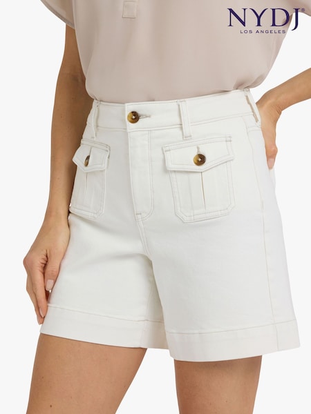 NYDJ White Berkyn Relaxed Denim Shorts With High Rise And Front Button Flap Pockets