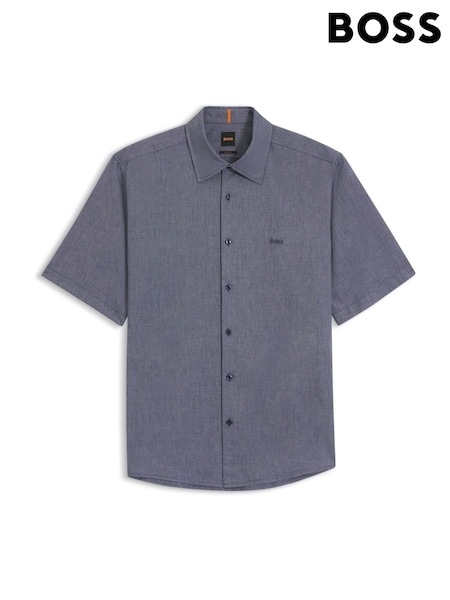 BOSS Navy Regular Fit Short Sleeve Linen Shirt