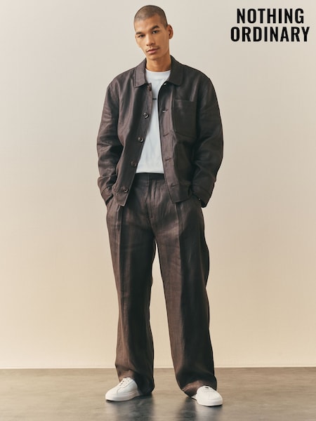 Nothing Ordinary Chocolate Brown Pure Linen Herringbone Pleated Relaxed Fit Trousers